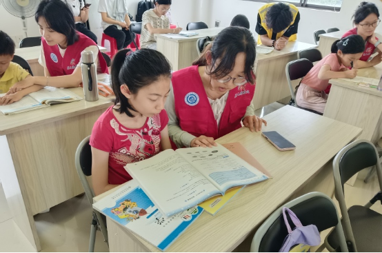 活动伊始,志愿者们迅速进入“辅导员”角色。针对孩子们在语文、数学等学科作业中遇到的难题,志愿者们采用“一对一”精准陪伴模式,耐心梳理知识点,拆解解题步骤。从化解孩子们初见时的腼腆,到细致讲解每一个疑惑,志愿者们用浅显易懂的语言帮助孩子们理清思路,不仅攻克了学业上的“拦路虎”,更缓解了家长们的辅导焦虑。