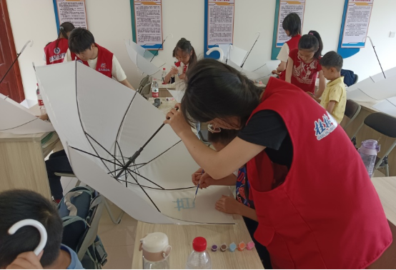 结束了充实的课业辅导,趣味满满的“透明雨伞创意绘画”环节瞬间点燃了现场氛围。在志愿者的引导下,孩子们打破思维局限,拿起画笔在伞面上尽情挥洒创意。五彩斑斓的花草、可爱的卡通人物、蓝天白云与彩虹……原本朴素透明的雨伞,在孩子们的笔下变得色彩斑斓、独具特色。志愿者们全程陪伴,协助调色、倾听构思,与孩子们共同沉浸在艺术创作的快乐中。