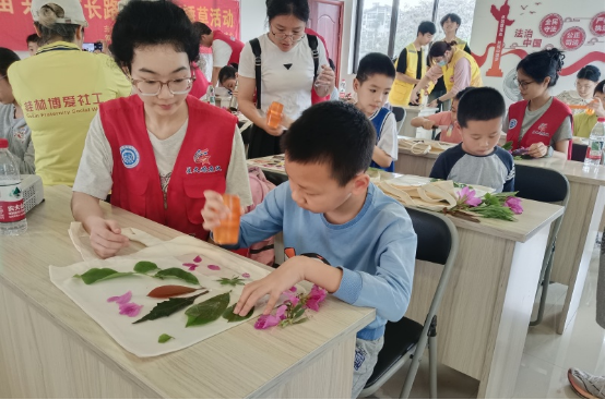 活动的最后环节,志愿服务团联合博爱社开展了“非遗花草拓染”体验活动。在专业指导和志愿者的协助下,孩子们规范摆放花草,轻轻敲击固色,亲眼见证了花草纹路印在布料上的奇妙过程。这一环节不仅让孩子们在动手实践中拓宽了视野,更在他们心底种下了传承中华优秀传统文化的种子。